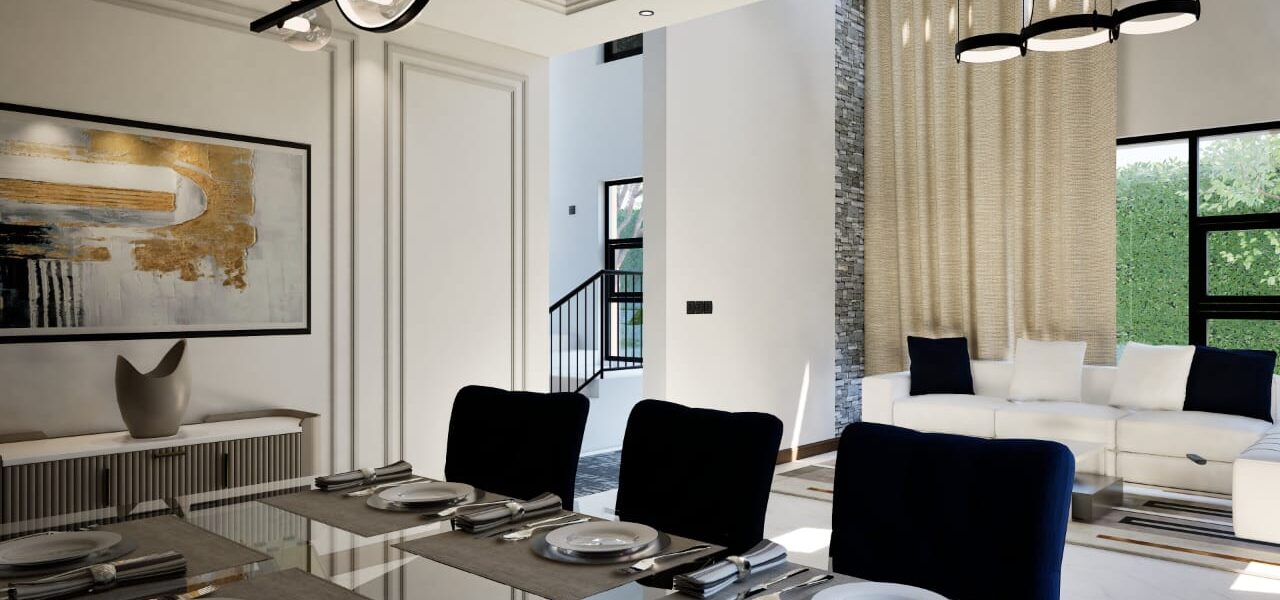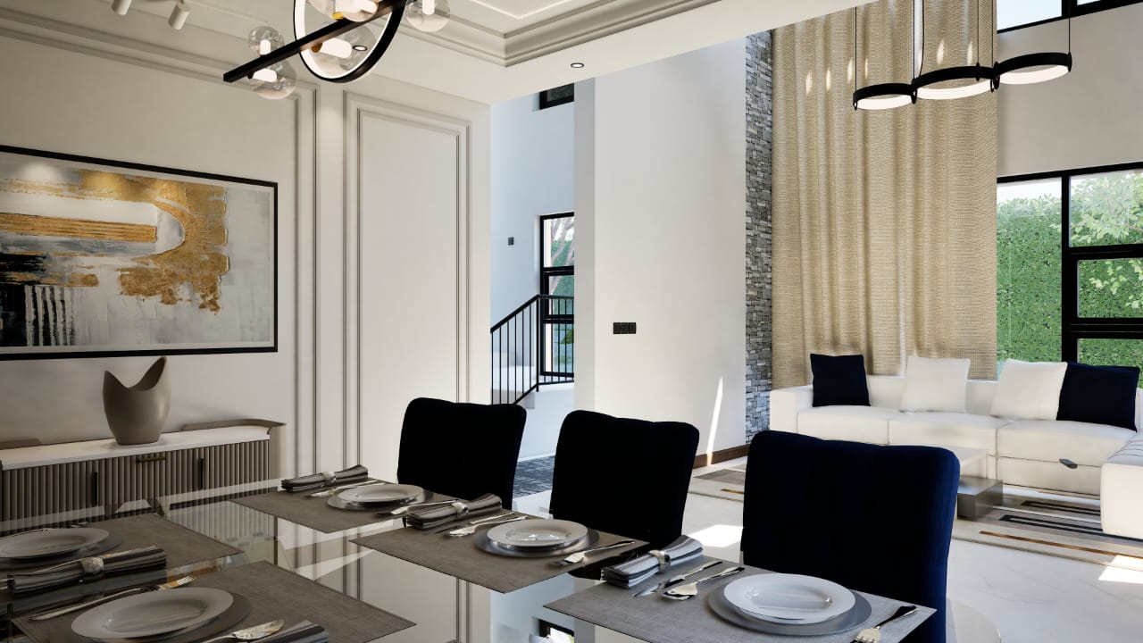 Each home features a spacious lounge with a fireplace and double-volume ceiling, creating a grand and airy atmosphere. The fully fitted kitchen flows seamlessly into the dining area, offering both functionality and style. All bedrooms are ensuite, and each unit includes a dedicated dhobi area, a Domestic Staff Quarter (DSQ), and parking for two vehicles.